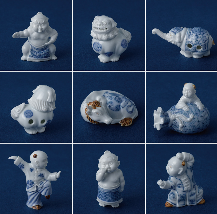 絵付けで描かれている唐子を立体化した唐子人形、象や獅子はみかわち焼の伝統を継いでいます。これらは、江戸時代後期から明治時代にかけて盛んになり、江戸時代には平戸藩からの献上品や贈り物として、明治以降は、技術を誇示した万国博覧会への出品を目的にしたものも多くあります。