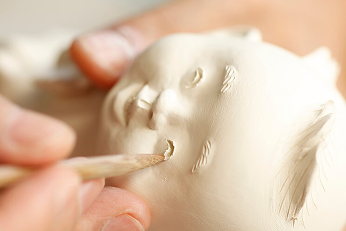 三川内焼の伝統技法「「手捻り(てびねり)」という技法を駆使し、思い描いた形を自らの手で立ち上げていき、ちょっとした表情の違いや指先まで細やかに表現しています。熊本の天草陶石を使用した、真っ白ではなく少し灰がかった白磁が、どことなく優しい雰囲気を醸し出しています。