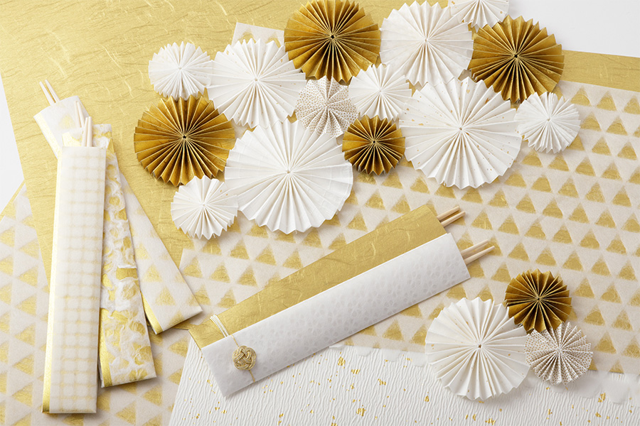 冬のパーティーシーズンに大活躍する和紙と金でまとめた箸袋やマットなどのモダンスタイルのテーブルウエア。テーブルウエアとしてだけでなく、お正月の室礼やクリスマスのデコレーションにもご利用いただけます。