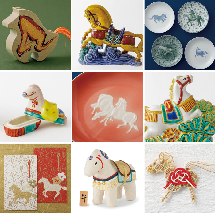 「午」にまつわる縁起物には、馬が象徴する「前進」「飛躍」「成功」の願いが込められています。また、左馬は「千客万来」「金運」の縁起物として、「うまくいく」という語呂合わせでも親しまれており、様々な縁起物があります。