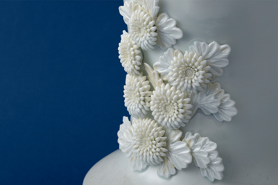 磁器製の菊の花で、「手捻り」の技法で用いられるパーツの一つです。先端の尖った竹の道具で、土の塊りから花びらの形に一枚ずつ切り出します。一周したところで、今度はそれらを一枚ずつ起こしていきます。何周もくり返すことによって立体的な菊の姿が現れてきます。壺や蓋、瓶に装飾として貼りつけられます。
