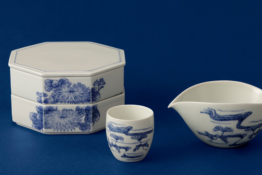 不老長寿や無病息災の象徴であり、古くから尊ばれてきた「菊」の染付のお重や酒器は、お正月やちょっとしたおもてなしに。