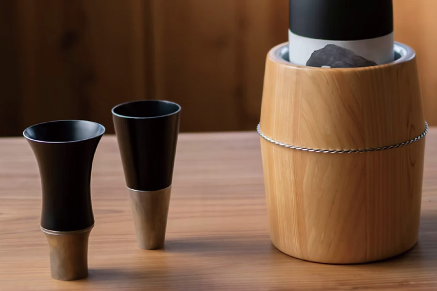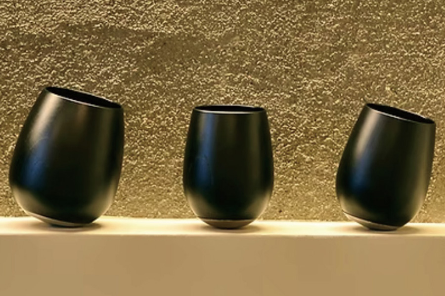 今回特集する「Kurourushi」は、木杯部を黒漆の技法で仕上げた高級感あふれるシリーズ。木と金属を組み合わせたユニークな形状、真鍮の重みが斬新かつ安定感のあるプロポーションを実現しました。唇に触れる木部は柔らかな温かみがあり、足元の真鍮は器に適度な重量感と楽しい”動き”を生み出し、味覚を超えた感性を刺激します。